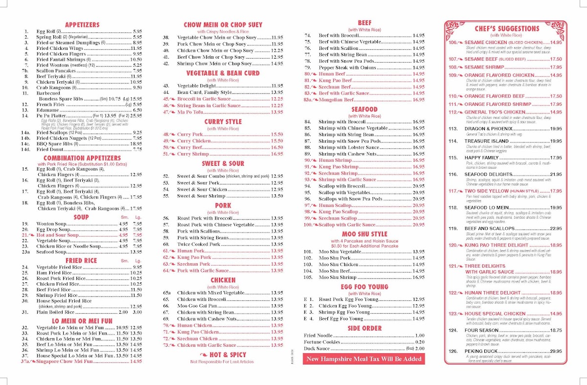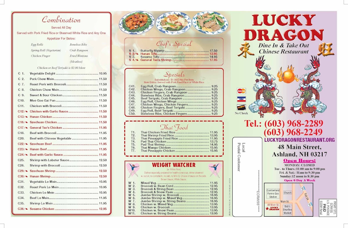 Welcome to Lucky Dragon - Ashland, a hidden gem nestled in the heart of Ashland, NH. This family-owned restaurant is celebrated for its vibrant and flavorful menu that showcases classic Chinese dishes made with fresh ingredients. The Sweet & Sour Combo offers delightful options like Pork, Chicken, and Shrimp, each priced affordably from $12.95 to $13.50. For those who crave comforting flavors, the Moo Shu Vegetable, priced at $13.95, is a must-try.